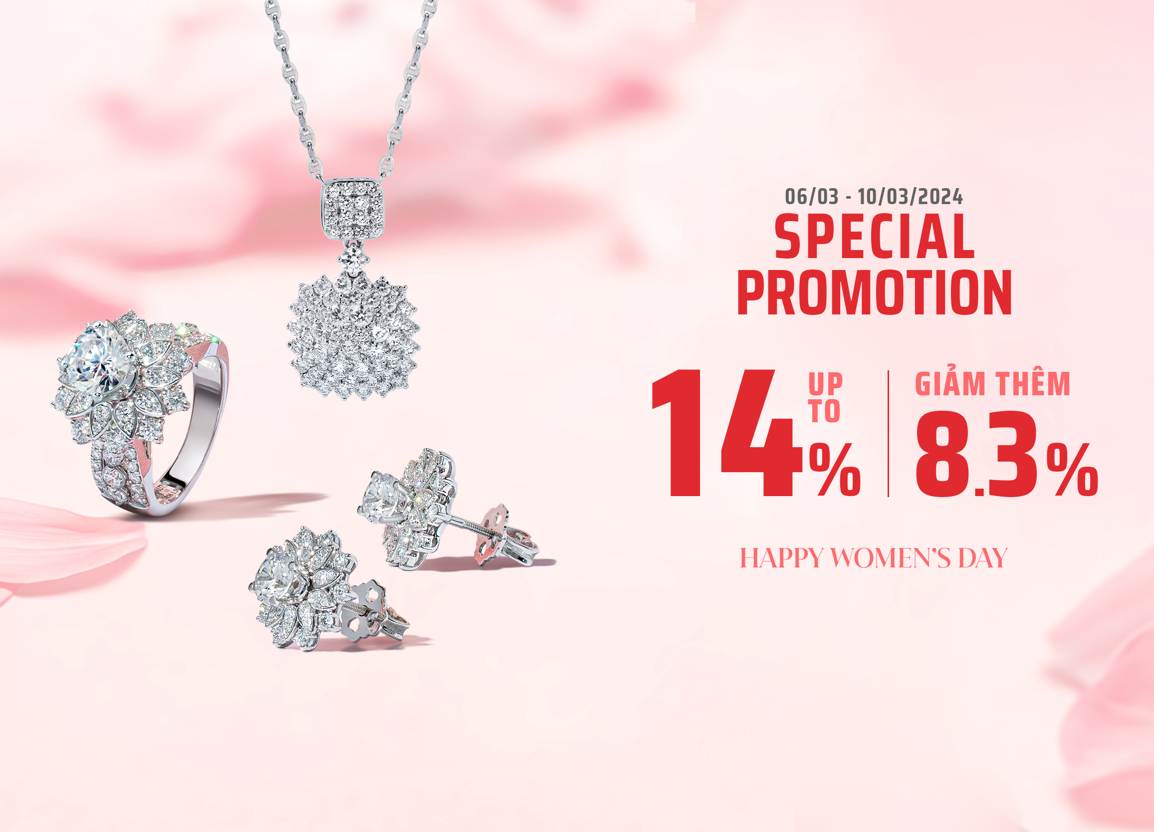 - GIẢM THÊM 8.3% cho tất cả trang sức kim cương, trang sức CZ, trang sức ngọc trai, trang sức đá quý màu, NÂNG TỔNG ƯU ĐÃI ĐẾN 22.3%.